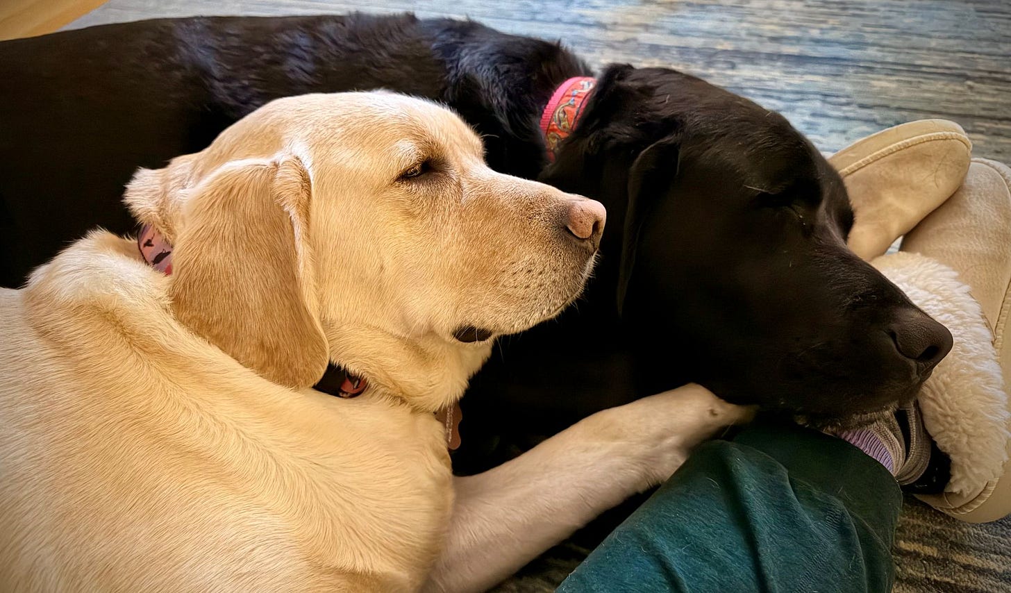 Labrador fur! Big Papi (aka Velvet Boy) and Minni Pearl, littermates, always at my side. I’ve known them since they were baby pups, and we became a family pack after they came to live with me when my dad died. I cannot imagine life without furry friends at my side—Big Papi is asleep on my foot as I type, keeping me anchored, warm. Every night we puppy pile for a while, their fur so soft, and, that’s everywhere.